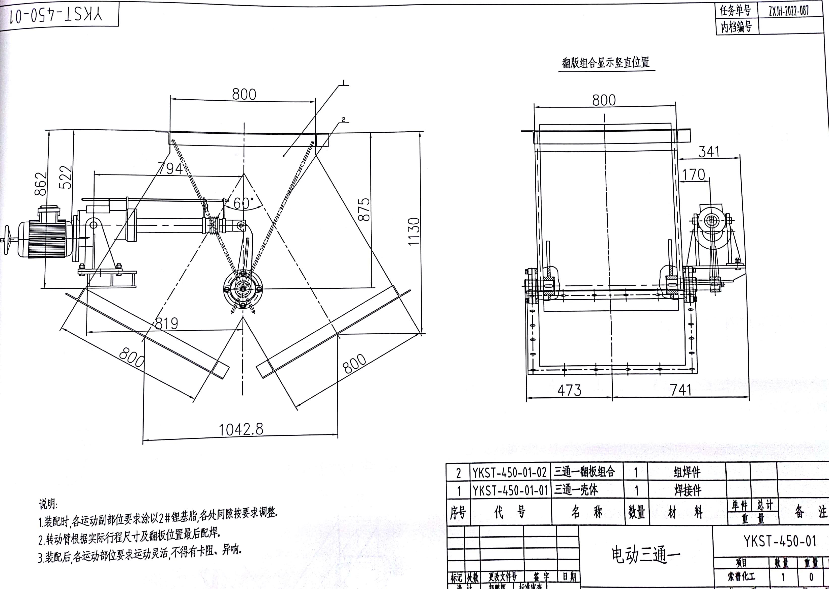 02080100004267 | 电动三通分料阀 | YKST-1000 推杆推力10KN,行程450mm,尺寸需现场测绘,外壁板Q235B,厚12mm,耐磨内衬16Mn,厚8mm,阀板16Mn | 套 | 1 |